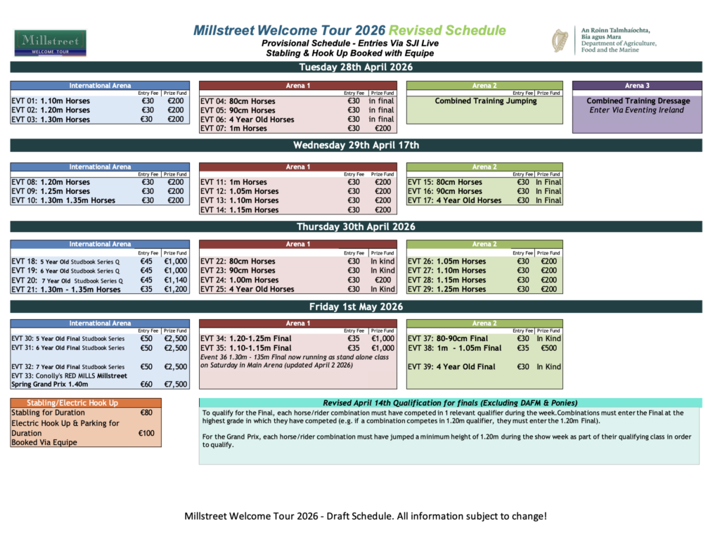 We are pleased to announce that the Millstreet Welcome Tour has been rescheduled and will now take place from Tuesday 28 April to Friday 1 May 2026. We are also happy to confirm a new date for Ponies, which will run on Sunday 26 April 2026.